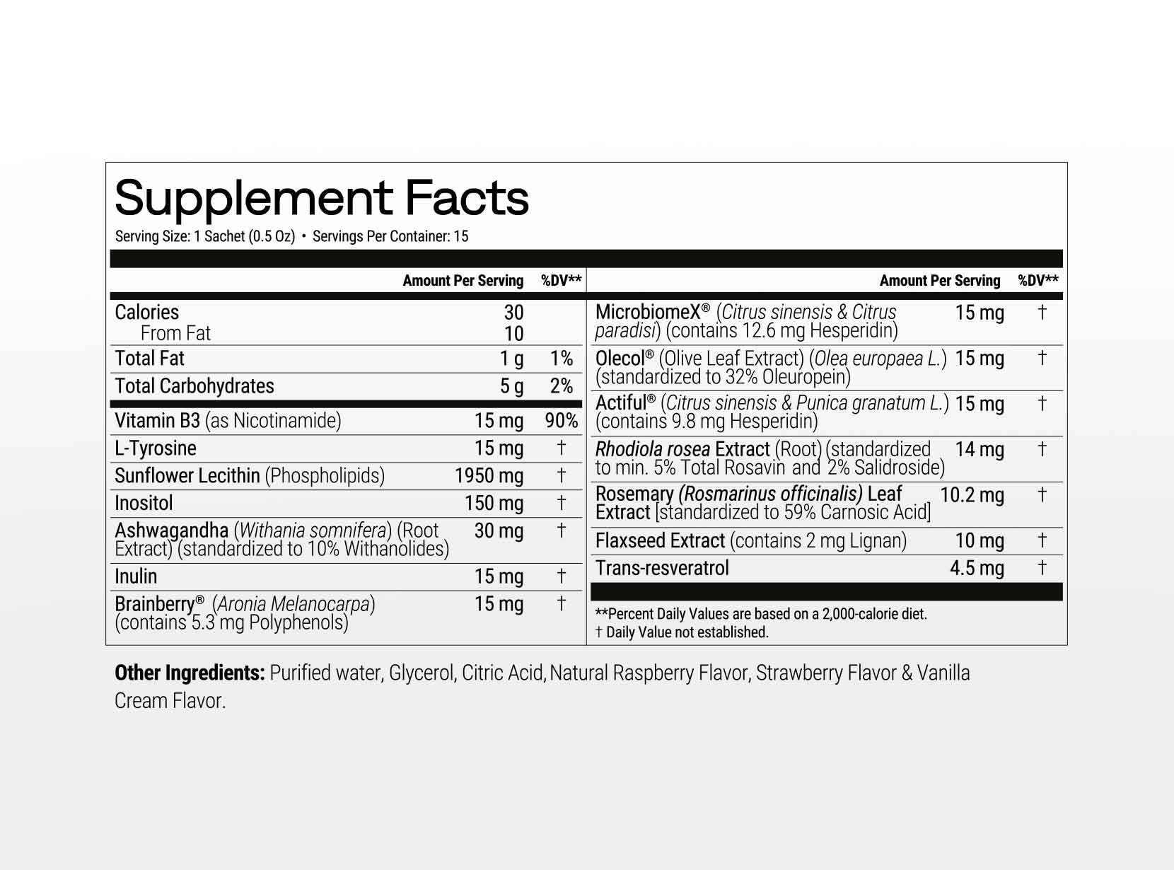 Wasser, Glycerol, Phospholipide (aus Sonnenblumen-Lecithin), Inositol, Himbeeraroma, Vanillecreme-Aroma, Erdbeer-Aroma, Citronensäure, Ashwagandhawurzel-Extrakt, L-Tyrosin, Niacin (Nicotinamid), Inulin, Brainberry®, MicrobiomeX®, Olecol®, Actiful®, Rosenwurz-Extrakt (Rhodiola rosea), Antioxidationsmittel: Rosmarin-Extrakt, Leinsamen-Extrakt (Linum usitatissimum L.), Trans-Resveratrol.