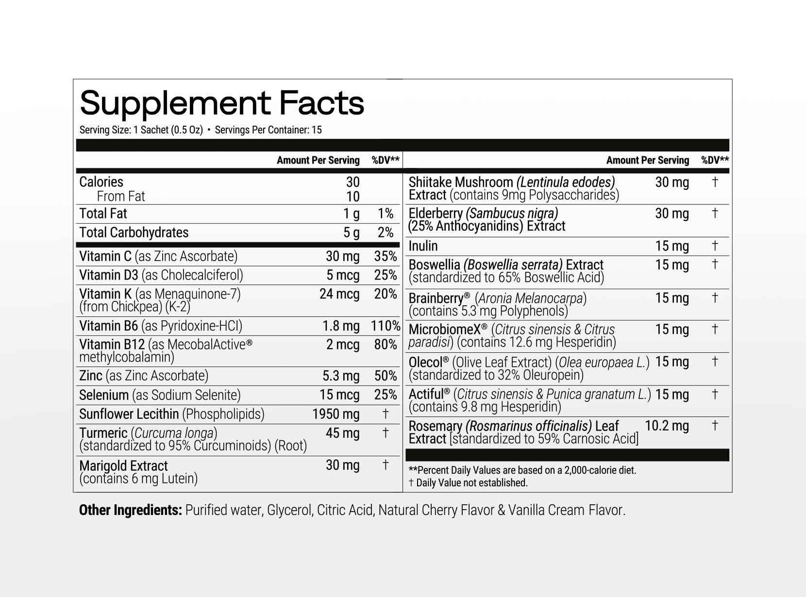 Wasser, Glycerol, Phospholipide (aus Sonnenblumen-Lecithin), Kirscharoma, Vanillecreme-Aroma, Curcuminoide aus Gelbwurz-Extrakt, Vitamin C und Zink, Ringelblumen-Extrakt, Shiitake-Extrakt, Wacholderbeeren-Extrakt, Vitapherole® T-70 Vitamin E, Weihrauchharz-Extrakt (Boswellia serrata), Inulin, Brainberry®, MicrobiomeX®, Olecol®, Actiful®, Citronensäure, Antioxidationsmittel: Rosmarin-Extrakt, Natriumselenit, Vitamin B6, Vitamin K2 (Menaquinon MK7), veganes Vitamin D3, Vitamin B12 MecobalActive®.